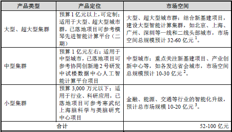 由于智能计算集群系统属于新兴业务,尚未有权威机构对其市场规模进行测算。寒武纪根据前期项目经验和市场开拓情况对于国内智能计算集群市场未来1-2 年的市场规模预估,这一市场将有52-100亿元的空间。