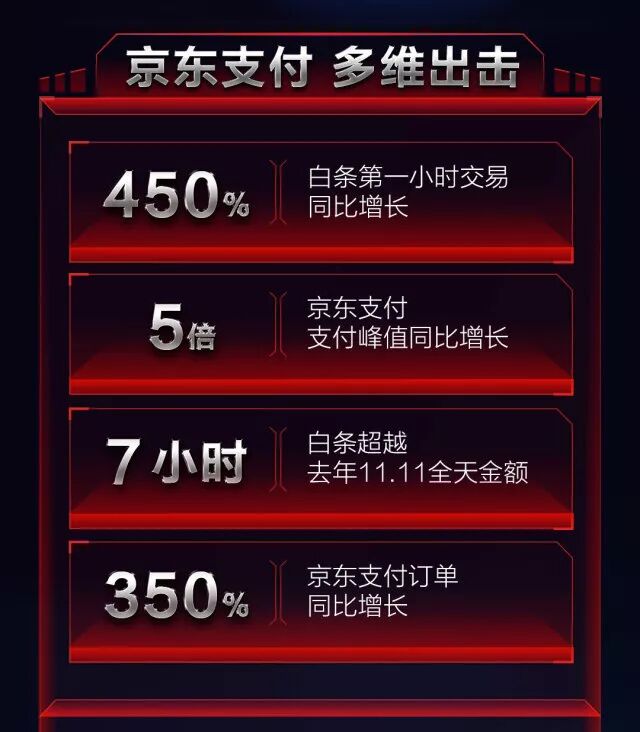 作为京东11·11“全球好物节”的坚强后盾,京东金融今年交出了一份亮眼的成绩单。11月11日0点到1点,白条支付交易额同比增长450%,7个小时白条支付交易额超去年11月11日全天;11月11日0点到12点,京东支付订单同比增长350%,支付峰值是去年同期的5倍。