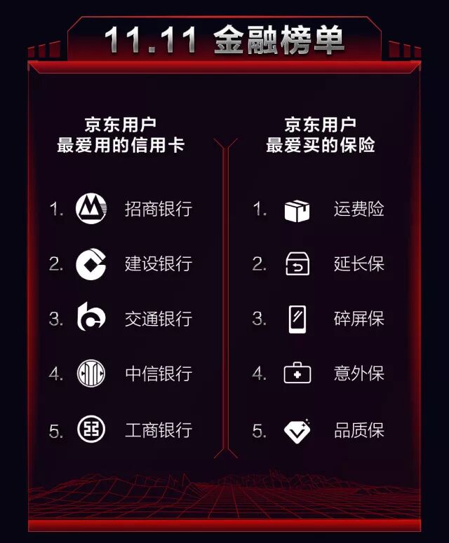 今年,京东金融首度发布了11.11金融榜单,揭示了11.11期间用户在支付、消费信贷等领域的消费偏好。榜单显示,11.11期间,招商银行的信用卡最受京东用户欢迎,其后四家银行依次为建设银行、交通银行、中信银行、工商银行。