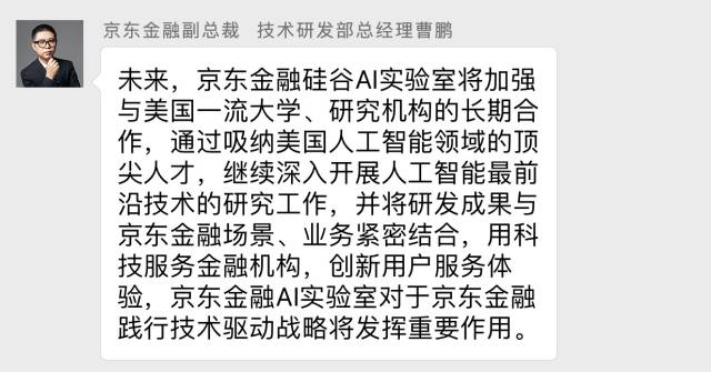 京东金融AI实验室也将发挥京东金融场景、数据和技术优势,吸纳美国优秀人才,聚焦机器学习、计算机视觉、自然语言理解等研究领域,探索前沿人工智能技术并致力于应用落地,为用户创造更大价值。