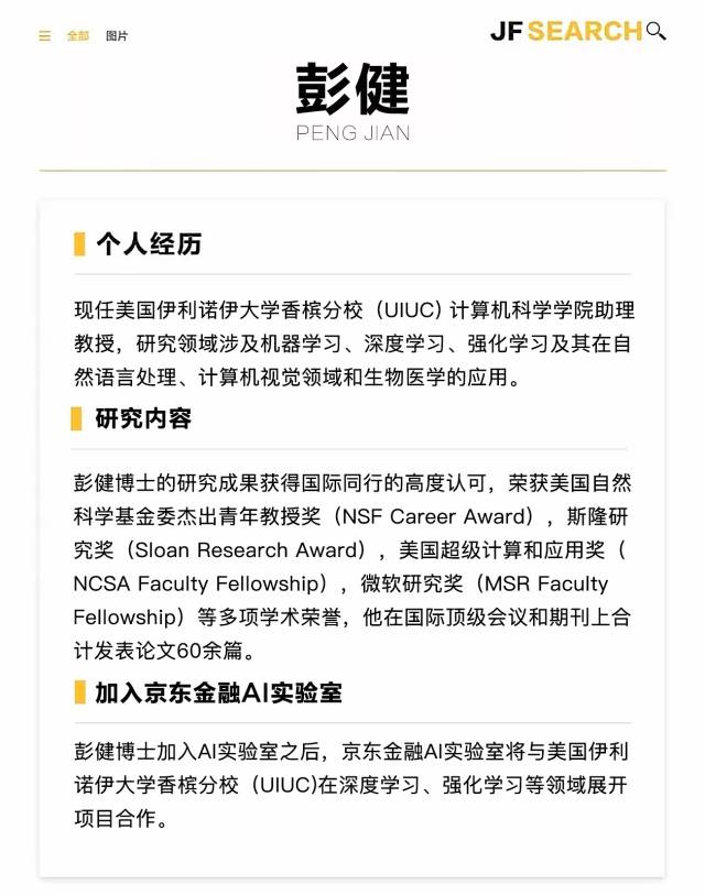 京东金融AI实验室投入运营当天,美国伊利诺伊大学香槟分校(UIUC) 计算机科学学院彭健博士正式加入京东金融,担任京东金融AI实验室首席顾问。这是继前亚马逊首席科学家薄列峰加盟之后,京东金融AI实验室迎来的又一位重量级人物。